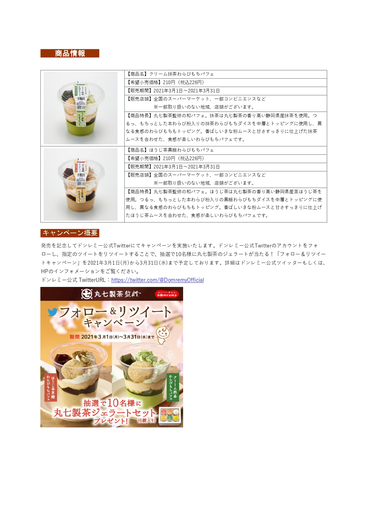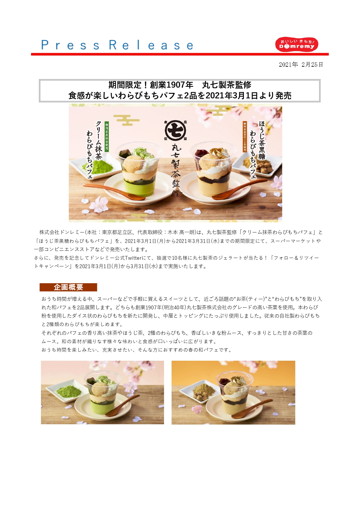 期間限定!創業1907年丸七製茶監修 食感が楽しいわらびもちパフェ2品を2021年3月1日より発売