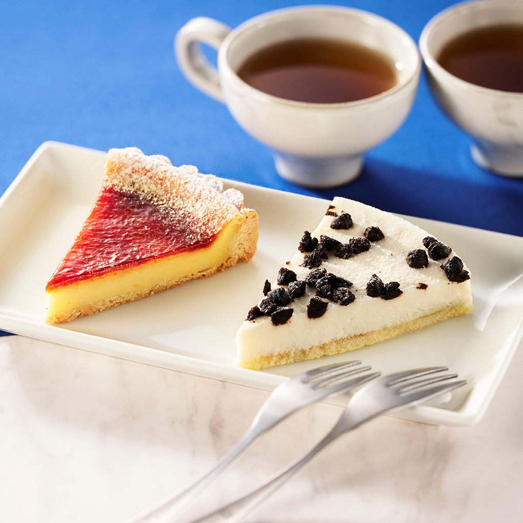 タルト×レアチーズの2つの味がお楽しみいただける「タルトもチーズも。」。ツヤのあるカラメルソースが目を引くクレームブリュレ風タルトは、タルト生地の上にバニラ入りのプリン生地を流してじっくりと焼き上げて、卵のコクとほろ苦いソースが相性抜群。レアチーズは、なめらかな口当たりのチーズムースとほどよい塩味のココアクッキーの組み合わせがクセになります。