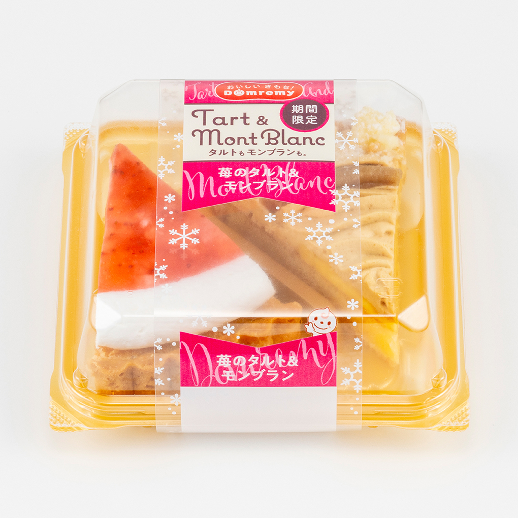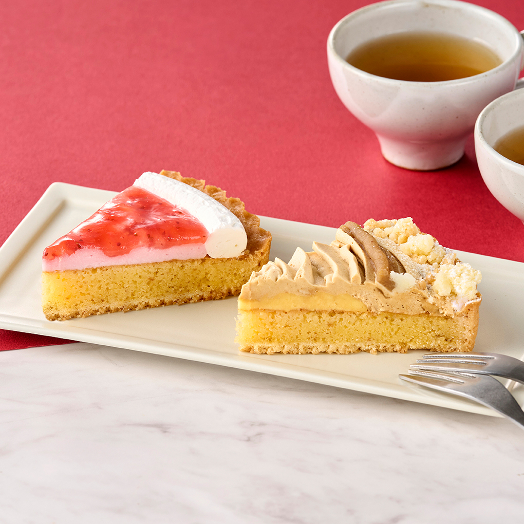 人気のフルーツ、苺を使用したタルトが新発売!苺のタルトはダマンドタルトの上に苺ムース、ホイップクリームを重ね、苺の果肉入りソースをかけた真っ赤な見ためがクリスマス時期にぴったりです。モンブランはカスタードムースとマロンホイップクリームを合わせて濃厚な味わいに。2つのタルトが味わえるお得な商品です。