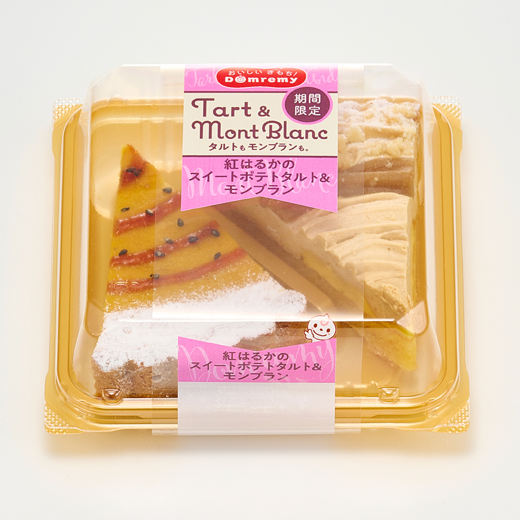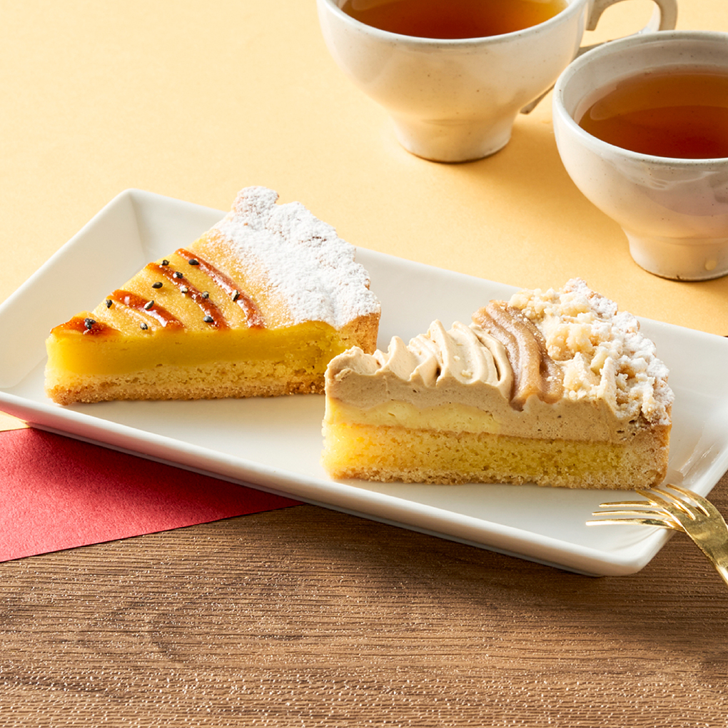紅はるかのスイートポテトとモンブラン。秋の味覚のデザートが2つ楽しめる「タルトもモンブランも。」の登場です。茨城県産紅はるかをふんだんに使用したスイートポテトをタルト仕立てに焼き上げ、味のアクセントにカラメルソースをかけました。対のモンブランはカスタードムースとマロンホイップクリームを合わせて栗の風味豊かな味わいに仕上げています。