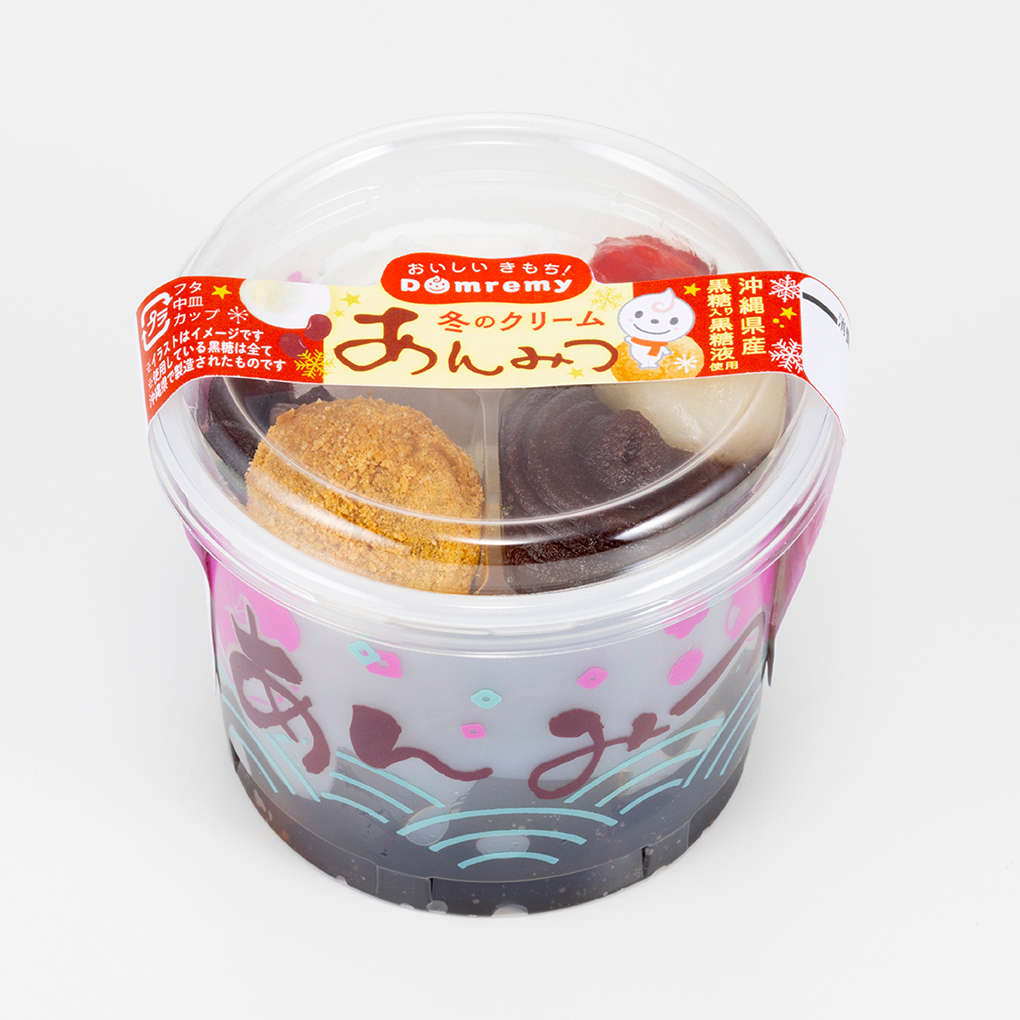 年間人気の和デザートのあんみつから、小豆をたっぷり楽しめる商品として登場!海草100%使用のコリッとした本格的な寒天ダイスに、沖縄県産黒糖液入り黒蜜ゼリーを合わせました。トッピングにはホイップクリーム、こしあん、いちごソース、白玉、わらびもち、小豆かのこを使用。小豆かのこの食感とこしあんをたっぷり楽しめる、この時期限定のあんみつです。