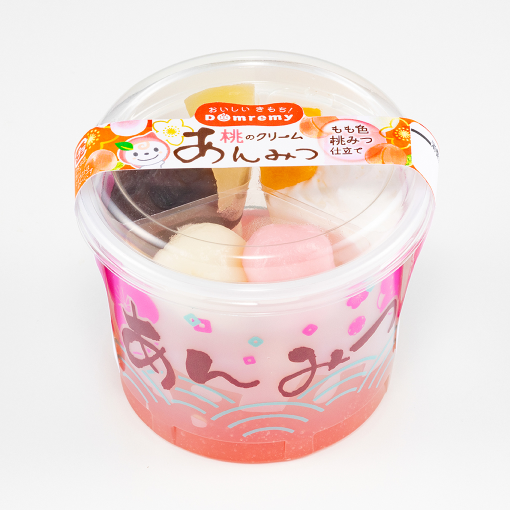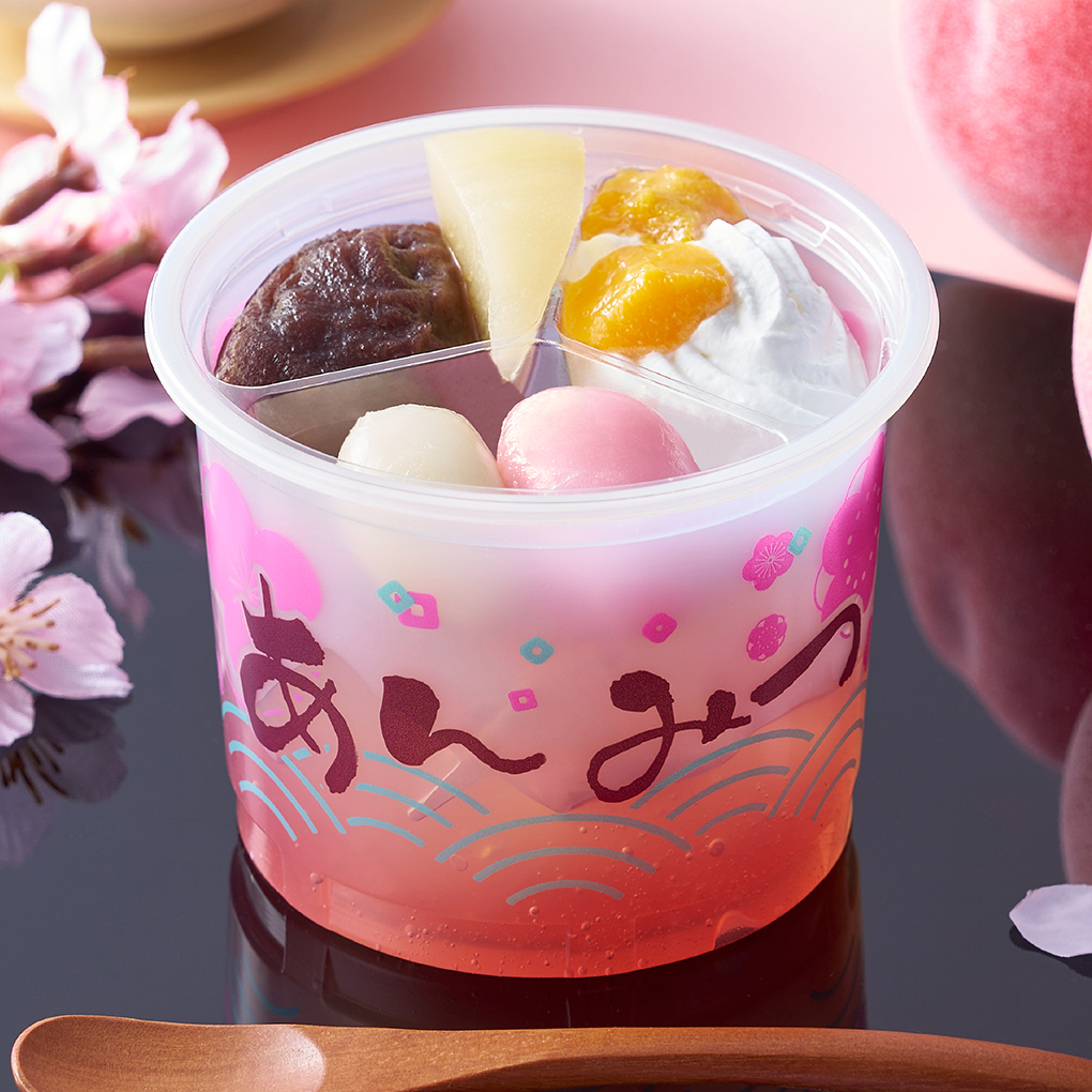 人気のあんみつシリーズから、桃のクリームあんみつが今年も登場!ピーチピューレを加えた、香り爽やかなピンク色の桃みつ仕立てのジュレに、こりこり食感の寒天を合わせました。トッピングは黄桃、白桃、紅白二色の白玉をご用意し、さらにこしあんとホイップクリームで食べごたえもたっぷりです。春を先取りした、華やかな桃のあんみつをお楽しみいただけます。