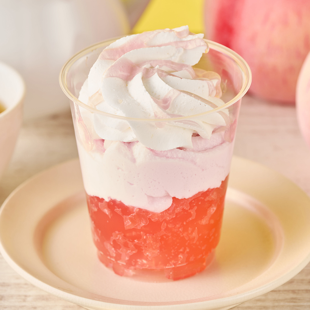 シンプルでボリュームのあるカップデザートシリーズから、新商品が登場!鮮やかなピーチゼリーとピーチムースをカップに絞り入れ、自慢のホイップクリームをたっぷりとトッピングして、ピーチ風味のソースで仕上げました。可愛らしいピーチカラーに仕上げた満足感のあるデザートです。