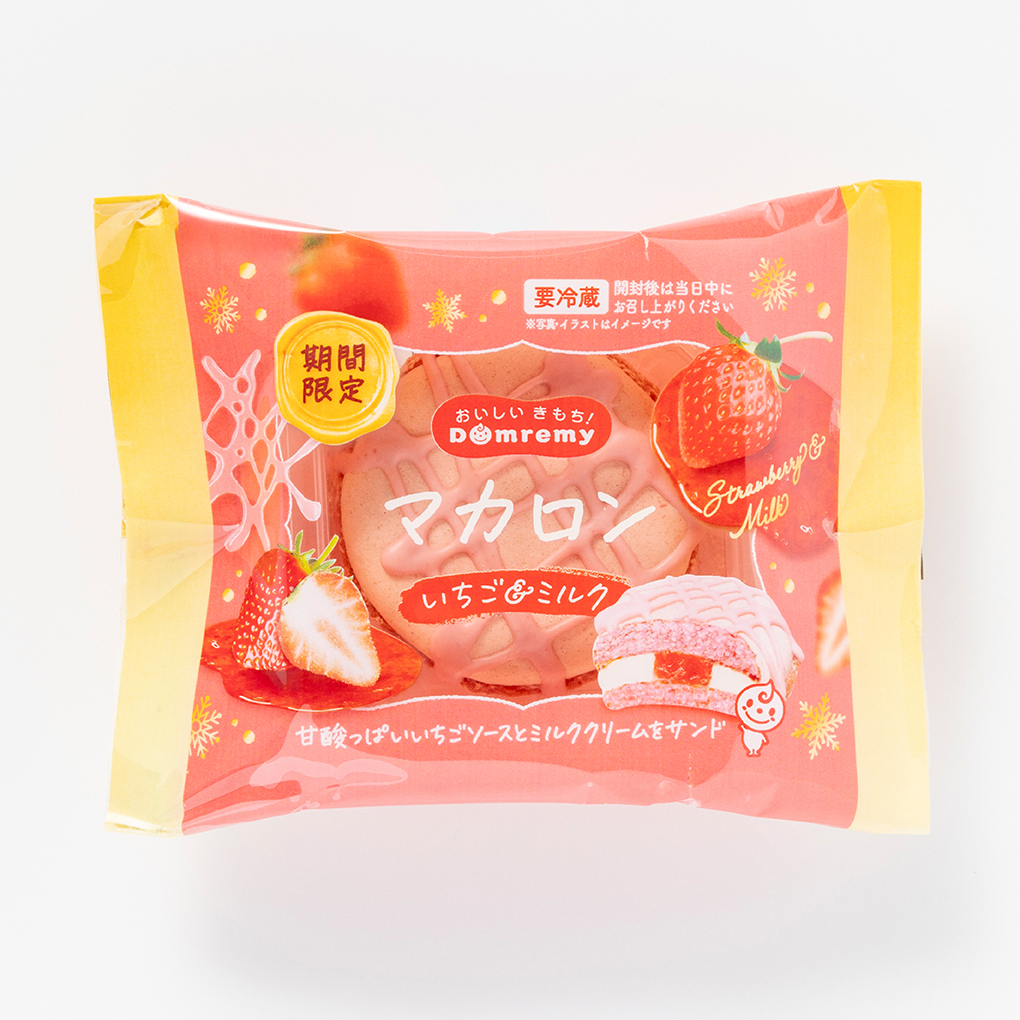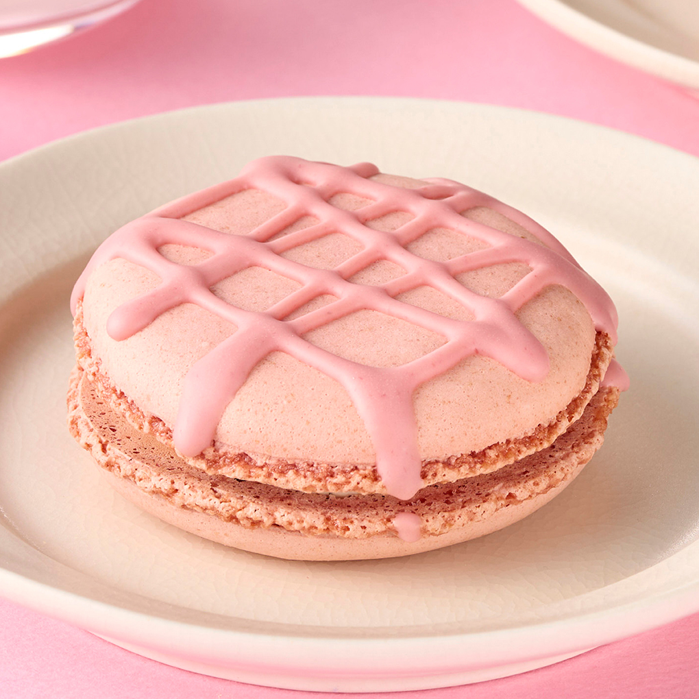 アーモンドパウダーをたっぷり使用したピンク色のマカロン生地に、いちごチョココーティングを格子状にかけ、いちごソースとミルククリームをサンドした本格志向の大きめなマカロンです。甘酸っぱいいちごとミルクのコクが、マカロンのおいしさを引き立てるデザートです。