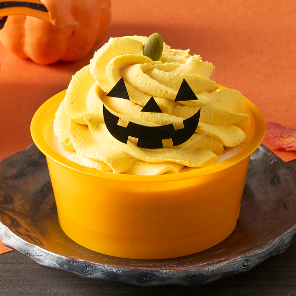 ハロウィンの主役!!北海道産えびすかぼちゃを使用した、おばけかぼちゃモチーフのパフェが登場!カラメルカスタードムースの上にホイップクリームをのせ、たっぷりのかぼちゃモンブランクリームで仕上げました。秋の素材を生かした、ハロウィンの時期にぴったりのデザートです。