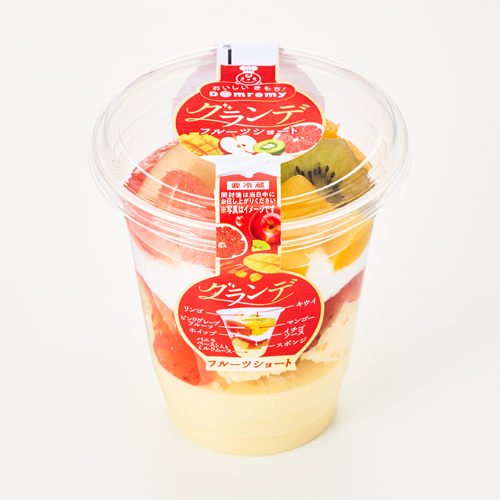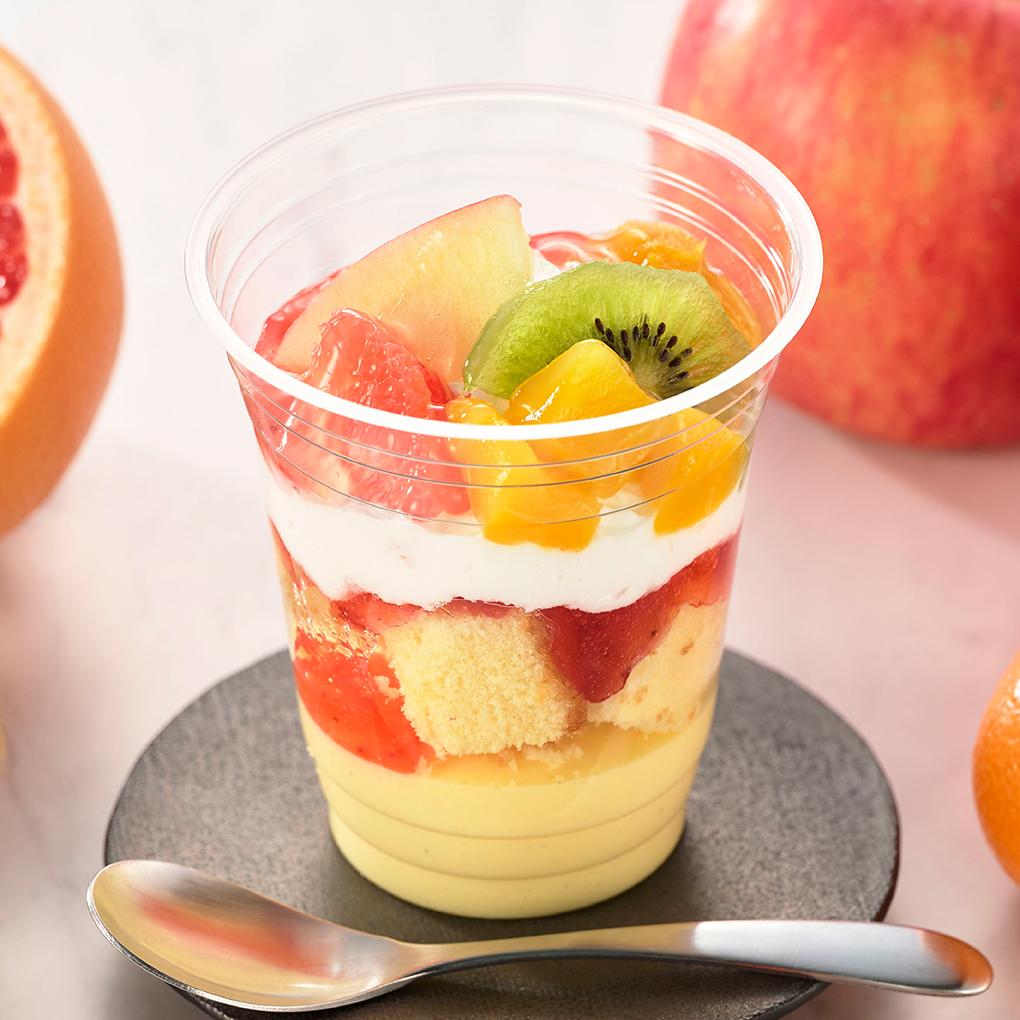 大容量のカップを使用したフルーツショートの第3弾が登場!マダガスカル産バニラを使用したムースにスポンジ、果肉入りの苺ジュレ、ホイップクリームを重ねました。定番のフルーツに加えて、季節を感じられるりんご、鮮やかなピンク系のグレープフルーツをトッピングした盛りだくさんのフルーツカップショートです。