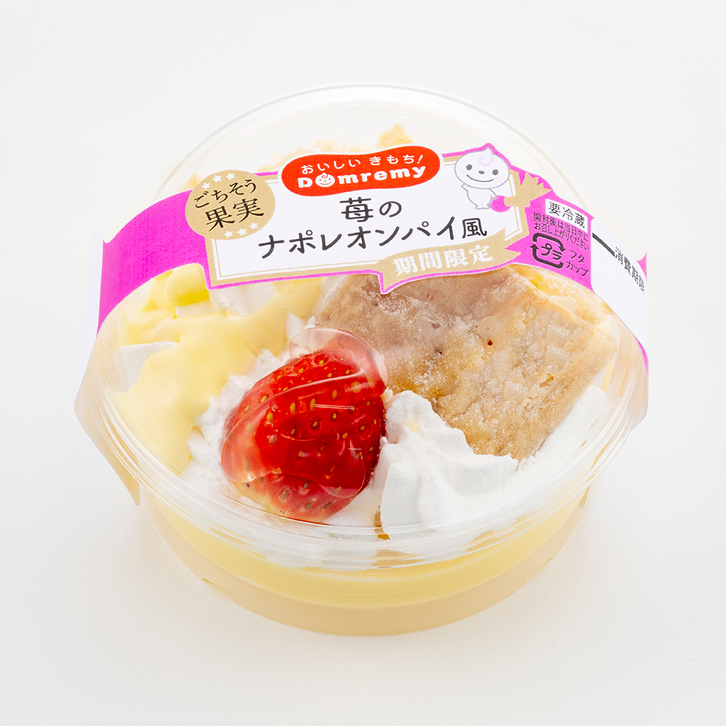 昨年も人気のごちそう果実が再登場!カスタードムースの上にたっぷりのホイップクリーム、さらにパイとアーモンドスライス、苺を可愛らしくトッピング。仕上げにカスタードソースをかけて、まるでナポレオンパイを食べているような商品に仕立てました。