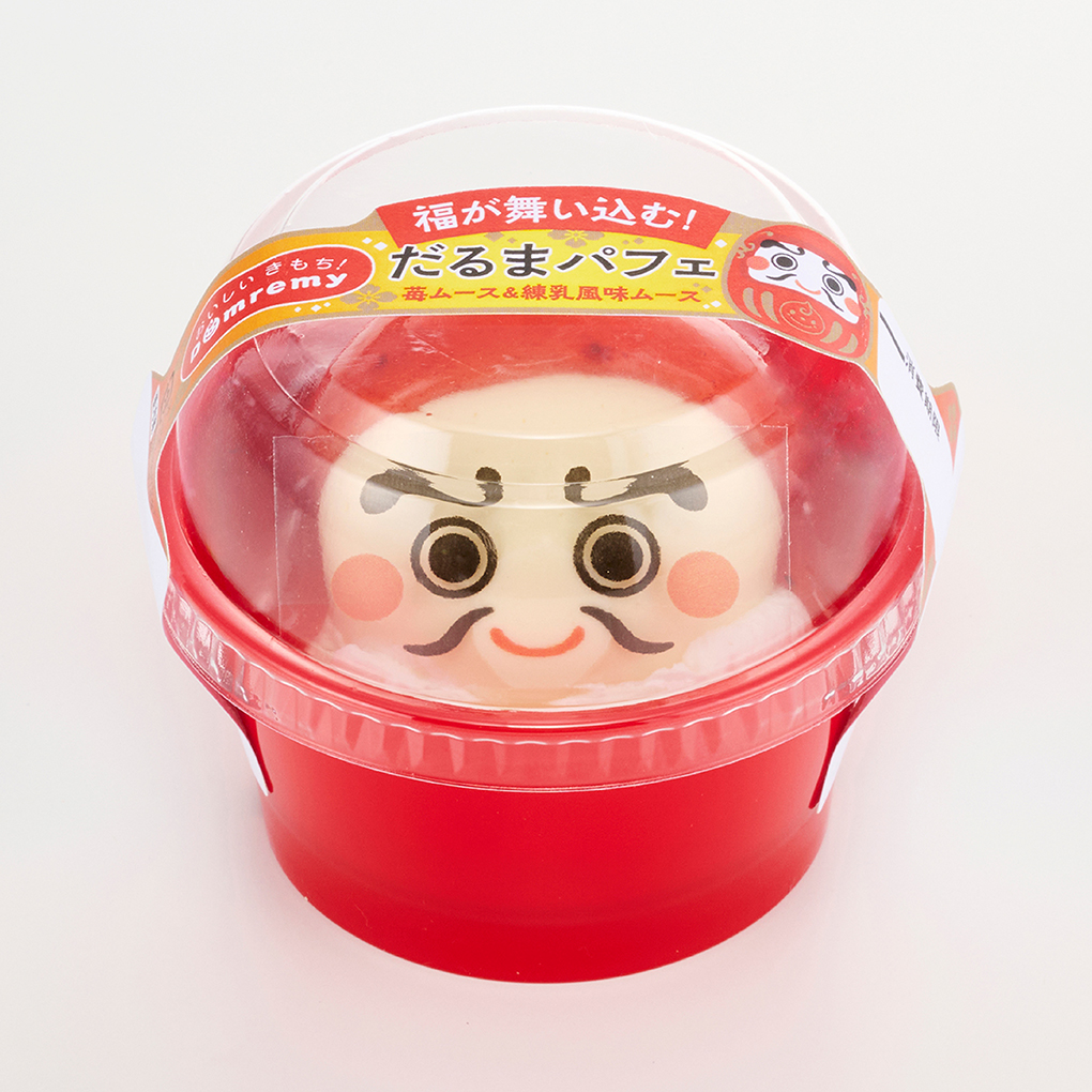 縁起物のだるまをモチーフにしたパフェが登場!苺ムースの上にスポンジを敷いてミルクムースで作っただるまの顔をトッピング、真っ赤な苺ソースをかけて華やかに仕上げました。新年のお祝いに、受験シーズンの応援に、かわいい!おいしい!縁起が良い!3拍子そろったスイーツです。