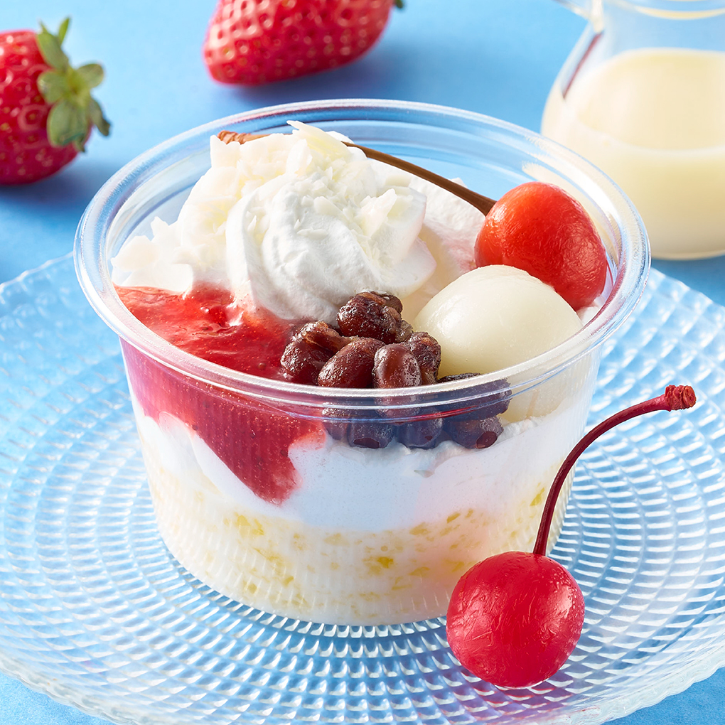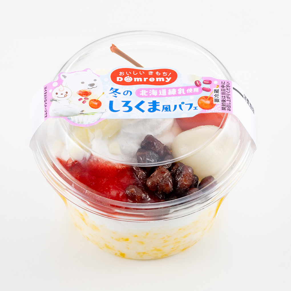 夏に好評のしろくま風パフェを、冬バージョンで販売いたします。つぶつぶ食感のゼリーを加えた練乳入りのミルクプリンはとろっとした口あたり。ホワイトチョコ、白玉、いちごソース、小豆、さくらんぼをトッピングして見ためにも楽しいパフェに仕上げました。