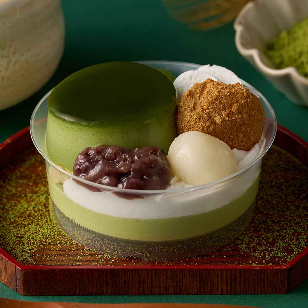 大人気の丸七製茶監修抹茶プリンアラモードが今年も登場!静岡県産の香り高い朝比奈1号抹茶を蒸しプリン、ムース、抹茶ソースに使用。もっちり食感のわらび餅と白玉に北海道産の粒あんを添え、いろいろな食感が楽しめるパフェにしました。抹茶蒸しプリンは昨年より抹茶を増量し、より一層抹茶を堪能していただけます。