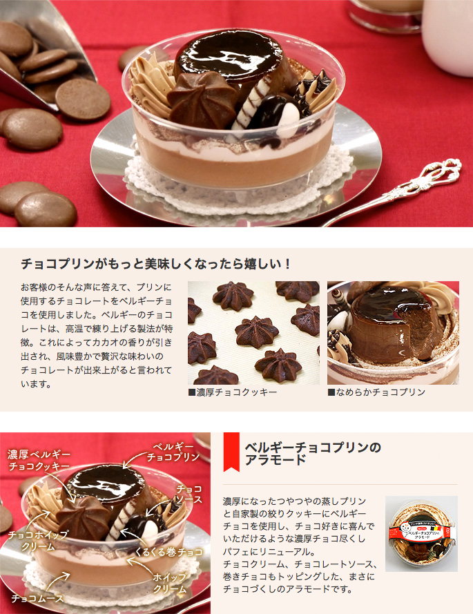 お客様のそんな声に答えて、プリンに使用するチョコレートをベルギーチョコを使用しました。ベルギーのチョコレートは、高温で練り上げる製法が特徴。これによってカカオの香りが引き出され、風味豊かで贅沢な味わいのチョコレートが出来上がると言われています。