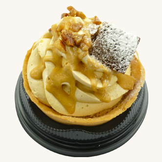 アーモンドの風味が香るザクッとしたタルトの上に、キャラメルクリームを絞り、目を引くチョコフィナンシェやキャラメルと相性の良いナッツをトッピング。たっぷりのビターキャラメルソースで仕上げました。